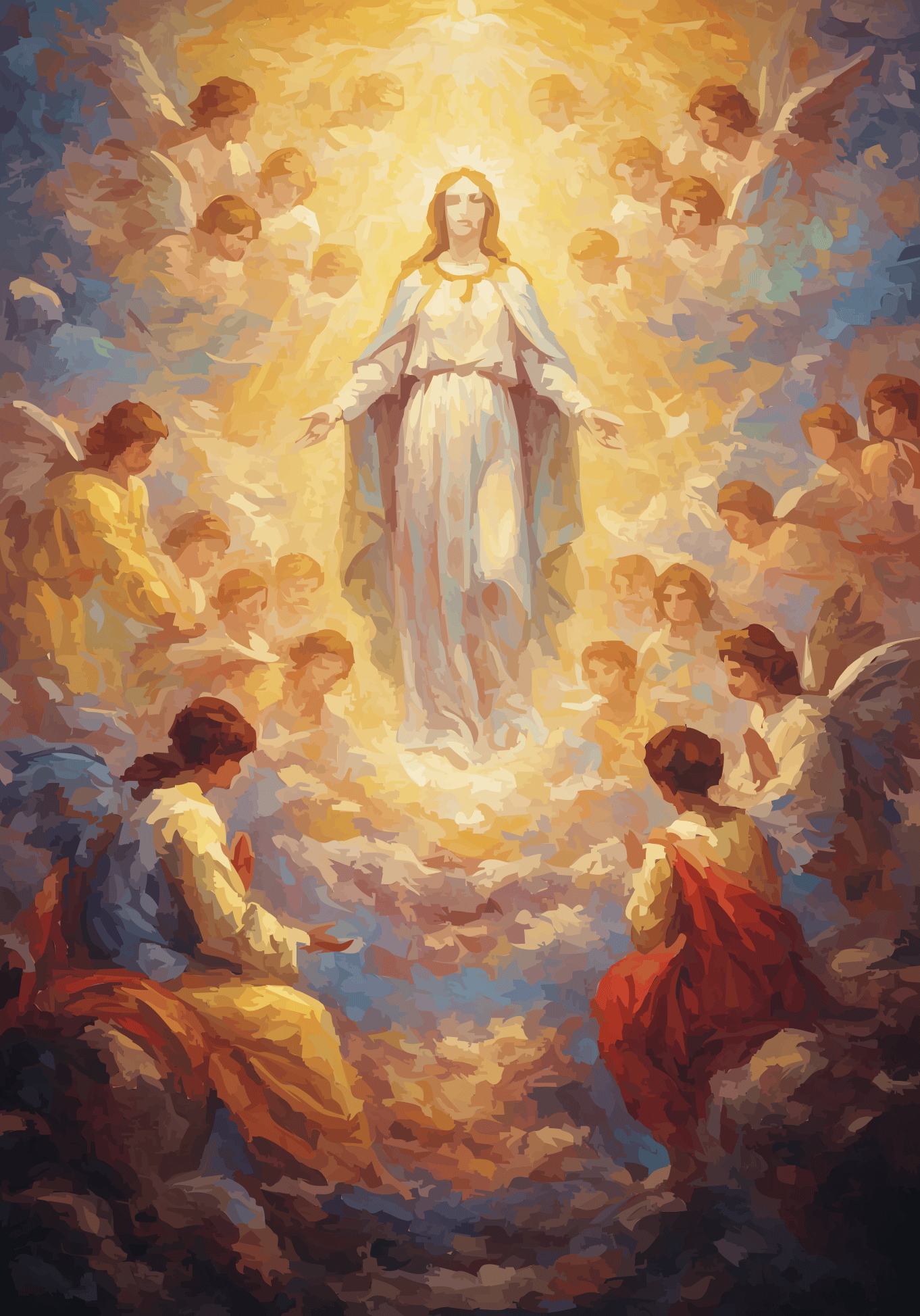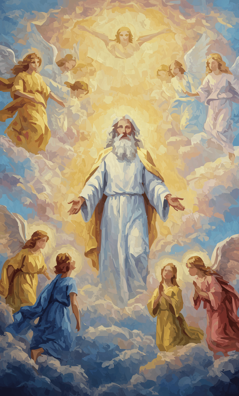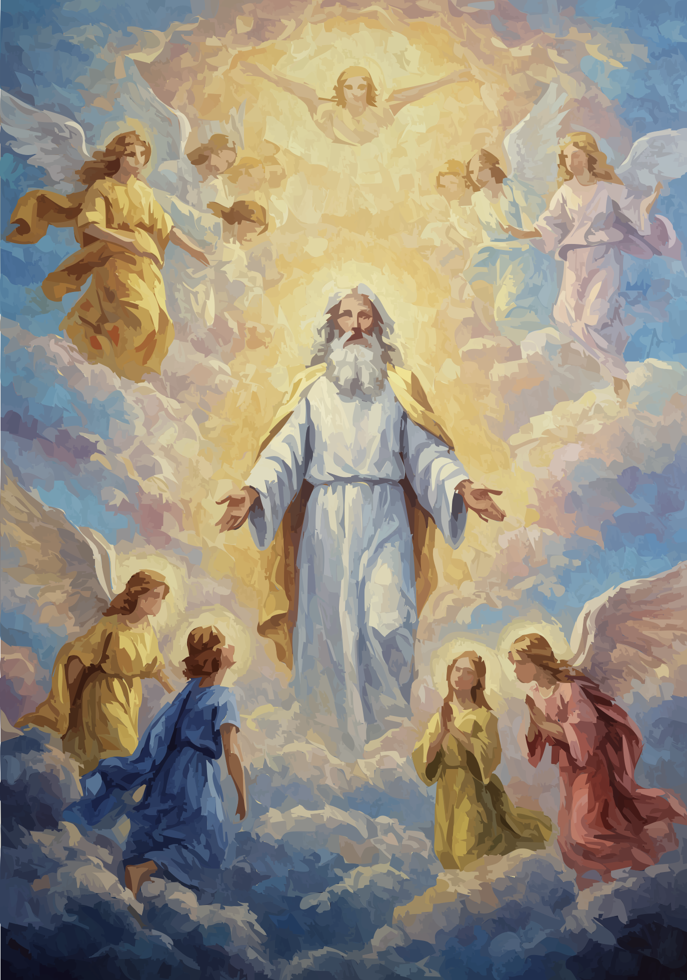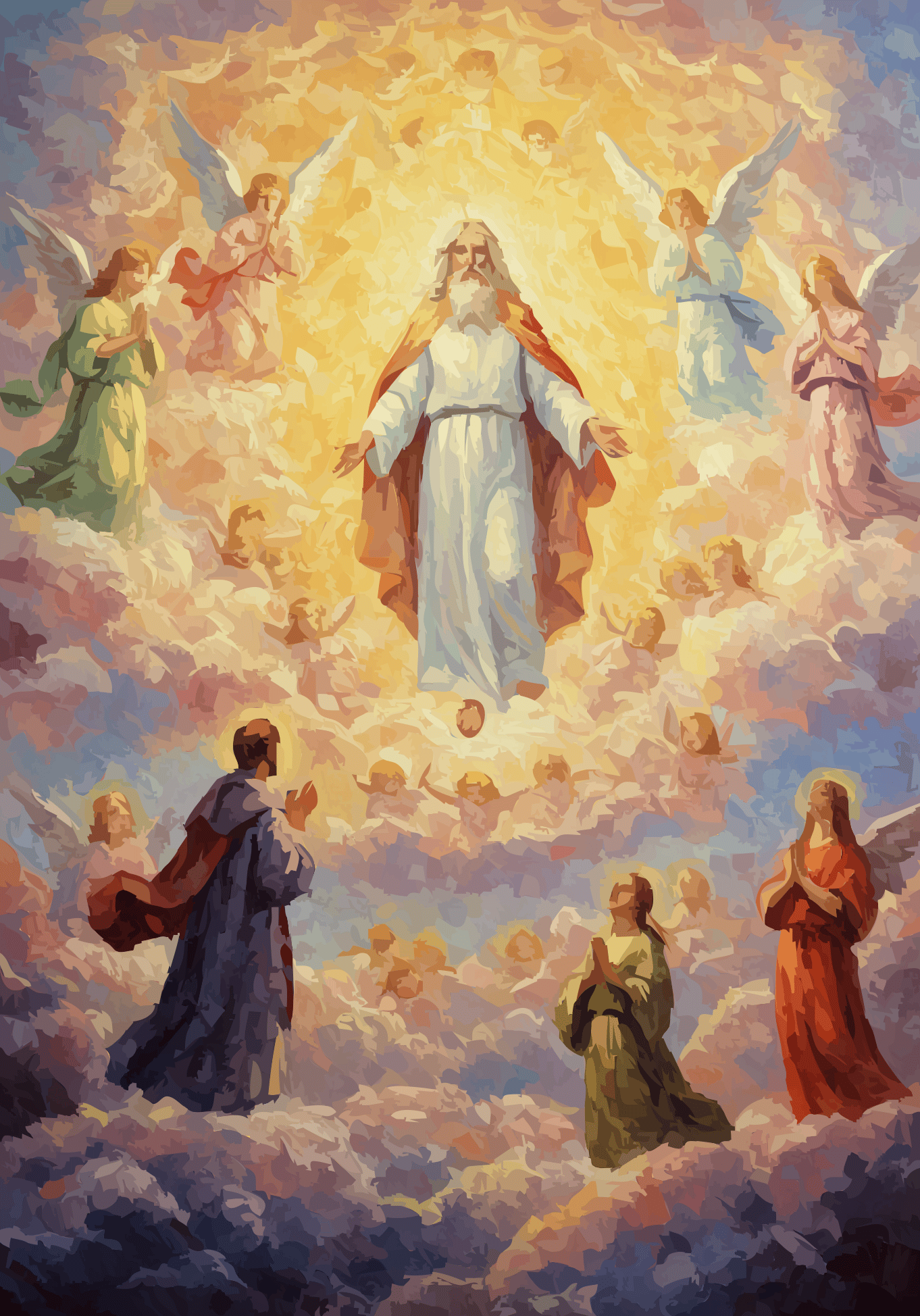 Behold the source, not the statue. From a radiant, genderless core, creation spirals outward in a vortex of feather and fervor. Angels are not attendants, but energetic extensions—a tempest of teal, gold, and crimson that renders the sky a cathedral of pure, joyous genesis.